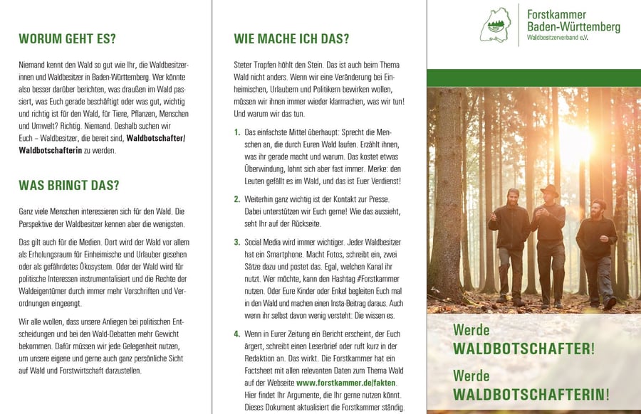 Bei der Mitgliederversammlung der Forstkammer in Schwäbisch Gmünd wurde die Aktion „Waldbotschafter“ vorgestellt. Werden auch Sie Waldbotschafterin bzw. Waldbotschafter! Was das bedeutet, lesen Sie in unserer Broschüre.